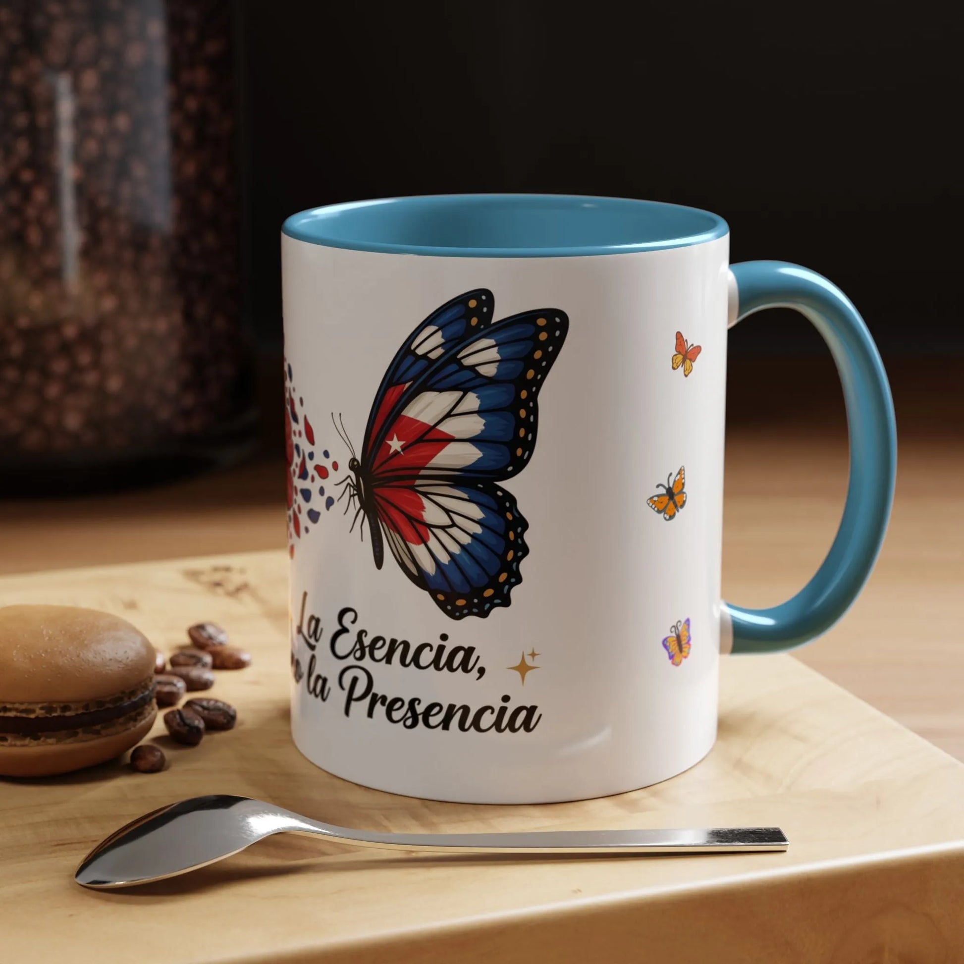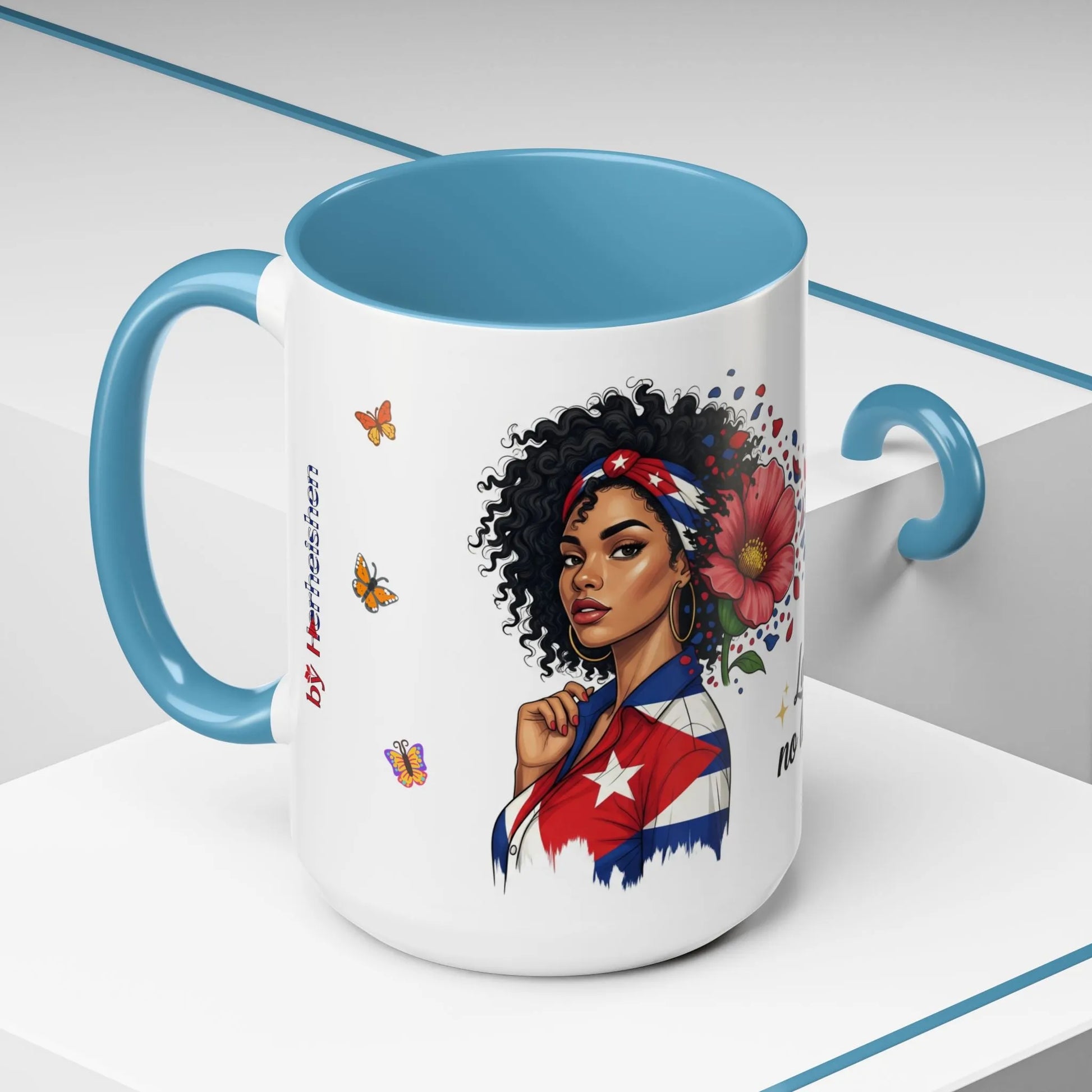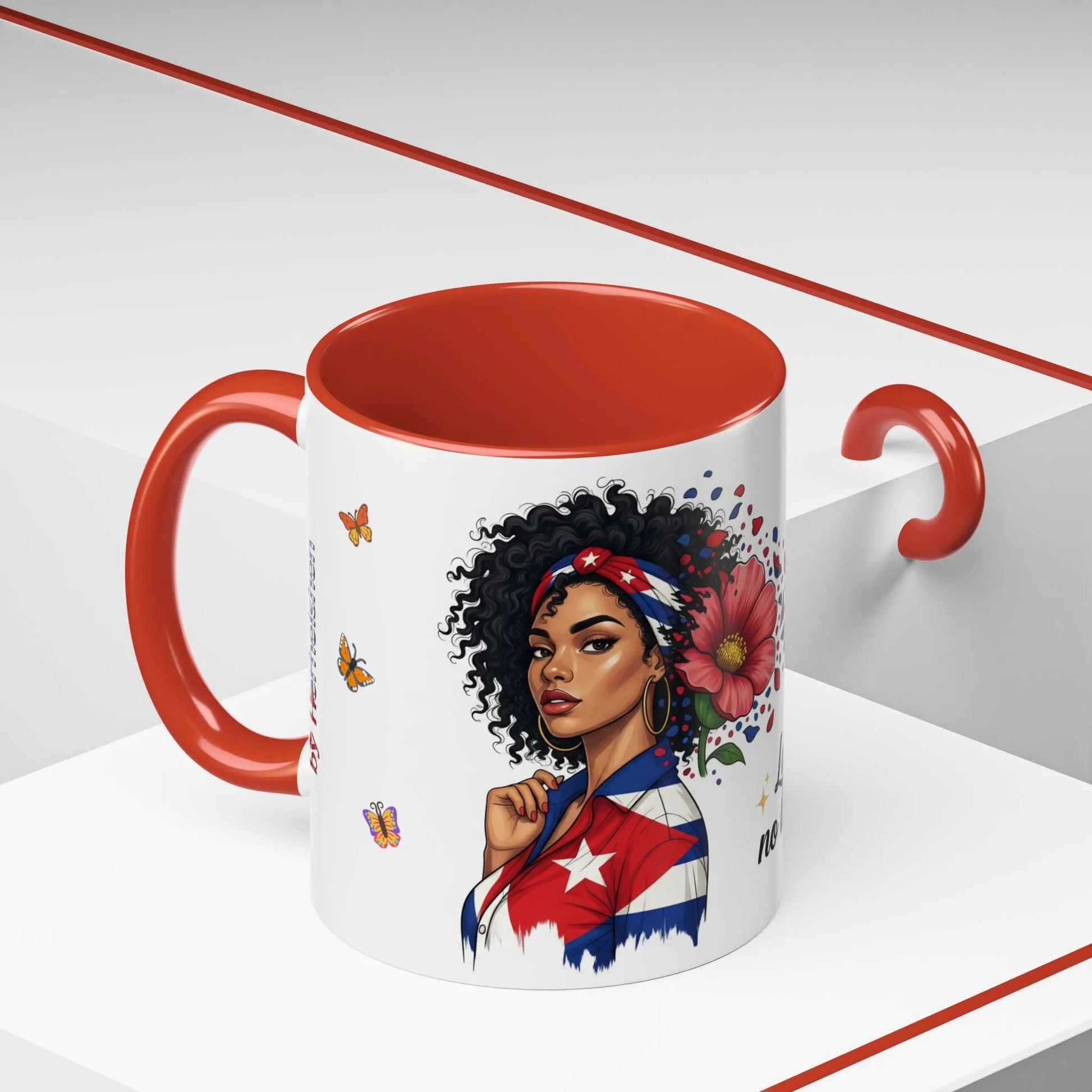 Esta taza cerámica con acento aporta arte brillante y lleno de alma a tu ritual diario de café. La cerámica blanca con acabado brillante contrasta con el interior y el asa en color para enmarcar un diseño vibrante: un retrato orgulloso y expresivo, flores en pleno florecimiento y una mariposa rojo-blanco-azul que transmite un mensaje en español. Cada sorbo se siente como un momento íntimo de conexión cultural: cálido, audaz y familiar. El esmalte resistente mantiene los colores vivos con el uso diario, mientras que su seguridad para lavavajillas y microondas te permite disfrutar desde las mañanas con prisa hasta los tés nocturnos sin complicaciones. Disponible en tamaños de 11 oz y 15 oz, puedes elegir el color interior que mejor combine con tu estilo o tu cocina. Libre de plomo y BPA, esta taza está hecha para verse, usarse y amarse cada día.